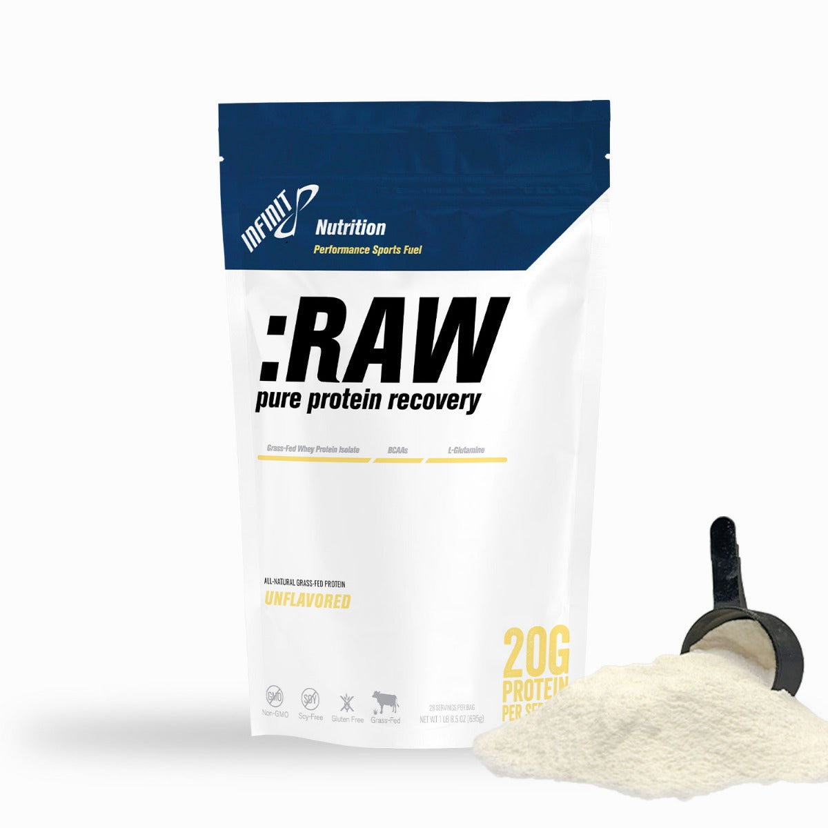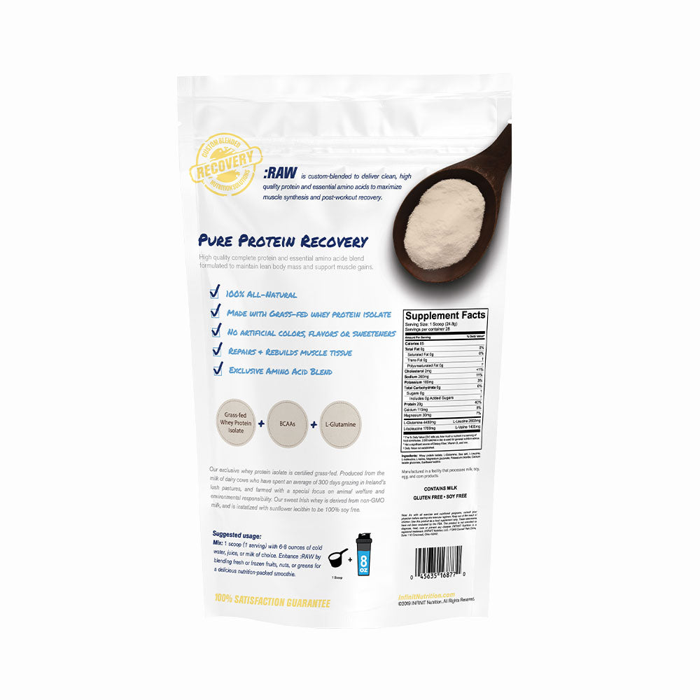 RAW is pure unflavored grass-fed whey protein isolate with added BCAAs and Glutamine — No sugars or sweeteners. No carbs. Nothing artificial.