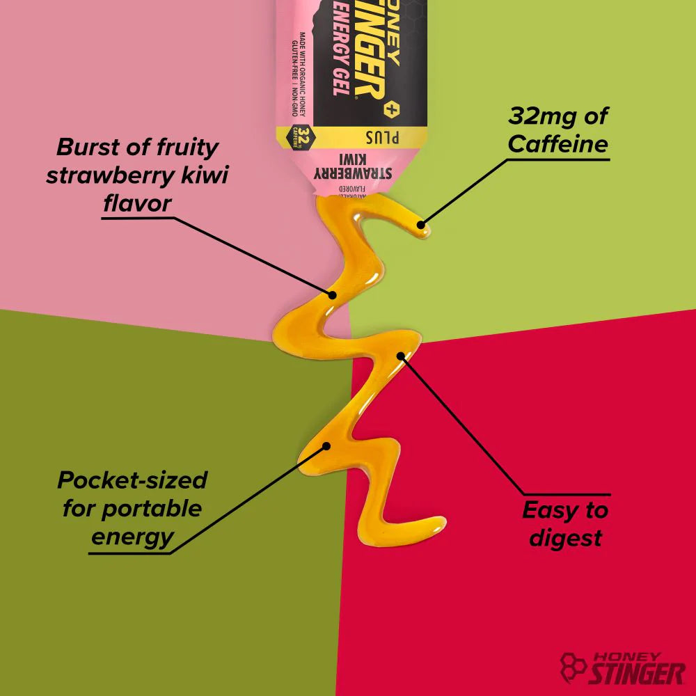 A caffeinated blend of organic honey + electrolytes, smooth texture, and the refreshing fruit flavors of strawberry and kiwi for optimal performance.